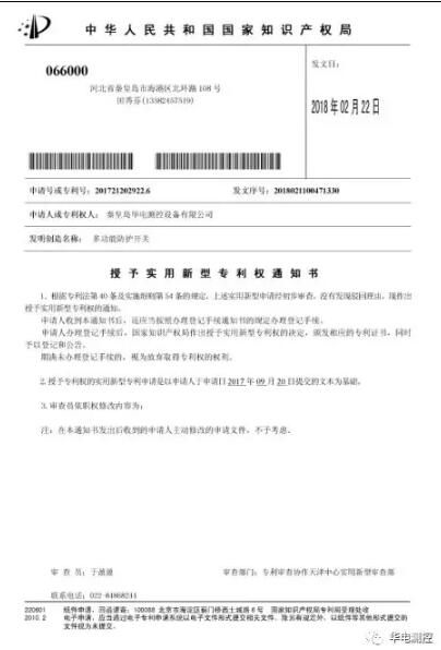 【企業(yè)要聞】公司申請(qǐng)的“多功能防護(hù)開(kāi)關(guān)”專利授權(quán)