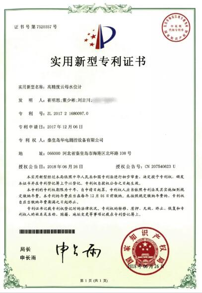 公司于2017年12月6日提交的“高精度云母水位計”(專利號:ZL 201721680097.0)專利已被中華人民共和國國家知識產(chǎn)權(quán)局頒發(fā)專利證書,授權(quán)公告日為2018年6月26日,授權(quán)公告號:CN 207540623 U。