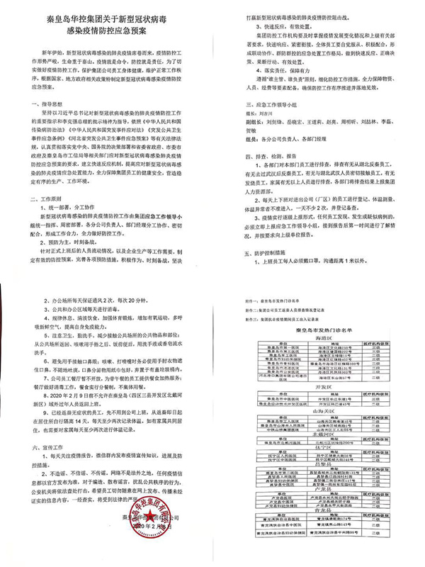 2月8日,在黨和國家領(lǐng)導(dǎo)人的親切關(guān)懷下,依照《中華人民共和國傳染病防治法》《中華人民共和國突發(fā)事件應(yīng)對法》《突發(fā)公共衛(wèi)生事件應(yīng)急條例》《河北省突發(fā)公共衛(wèi)生事件應(yīng)急預(yù)案》等有關(guān)法律法規(guī),秦皇島華控集團有限公司認真貫徹落實黨中央、國務(wù)院的決策部署和省委省政府、市委市政府、區(qū)委區(qū)政府、市工信局以及臨港物流園區(qū)等相關(guān)部門應(yīng)對新型冠狀病毒感染肺炎疫情的部署,在集團內(nèi)部編撰并下發(fā)了“秦皇島華控集團關(guān)于新型冠狀病毒感染疫情防控應(yīng)急預(yù)案”,建立快速反應(yīng)機制――成立了以董事長劉吉川為組長,集團公司領(lǐng)導(dǎo)班子成員為副組長,各分公司負責(zé)人、部門負責(zé)人為組員的“應(yīng)急工作領(lǐng)導(dǎo)小組”,提高應(yīng)對新型冠狀病毒感染的肺炎疫情應(yīng)急處置能力,全力保障集團員工的健康安全,營造穩(wěn)定有序的生產(chǎn)、工作環(huán)境。