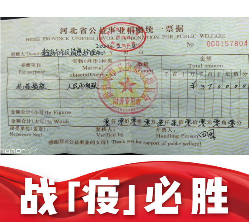 截止到2月9日捐款倡議結(jié)束,兩項捐款活動共計參與125人次,募集到了款項10500元,目前已將募集到的款項捐贈到了秦皇島市應(yīng)對新型冠狀病毒感染的肺炎疫情工作領(lǐng)導(dǎo)小組辦公室公示的秦皇島市衛(wèi)生健康委員會賬戶上。