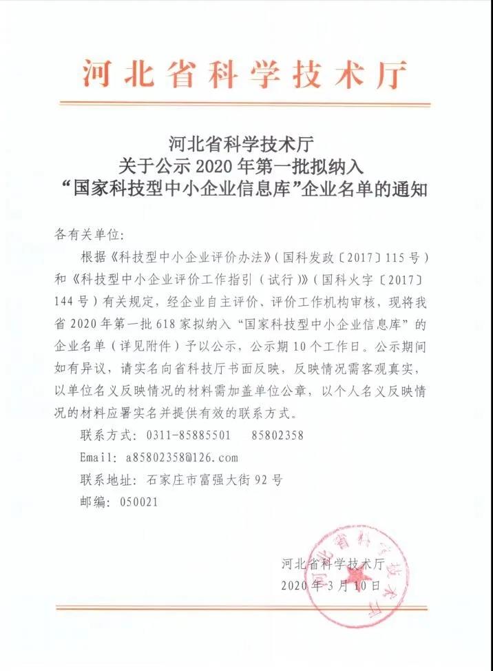 近日,河北省科技廳根據(jù)《科技型中小企業(yè)評價辦法》(國科發(fā)政【2017】115號)、《科技型中小企業(yè)評價辦法工作指引(試行)》(國科火字【2017】144號)要求,公示通過河北省2020年第一批“科技型中小企業(yè)”名單。我公司憑借在企業(yè)科技創(chuàng)新領(lǐng)域的成就成功入選,入庫登記編號:202013030209000247。
