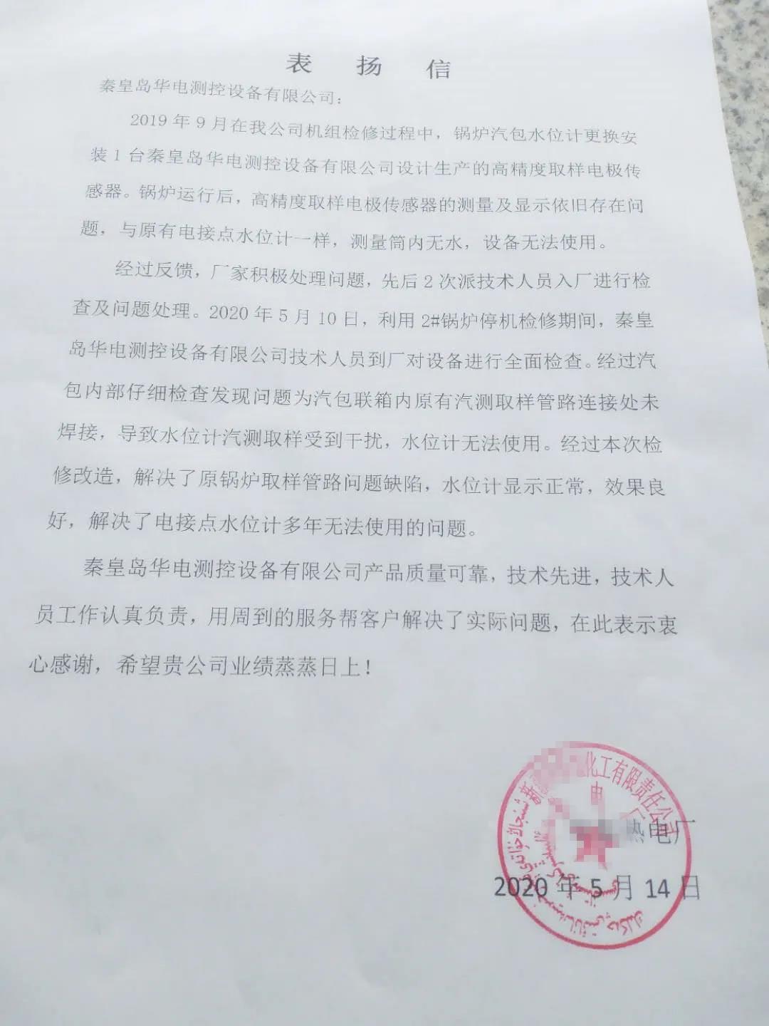 2020年5月15日,華電測控收到來自新疆某化工有限公司的表揚信,表揚我公司解決了該廠鍋爐汽包電接點水位計多年無法使用的問題。信中對我公司的產(chǎn)品質(zhì)量、全新全意為客戶服務(wù)的理念以及技術(shù)人員認真負責(zé)的工作態(tài)度均給予肯定。