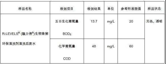 融力得®生物降解環(huán)保清洗劑經(jīng)英格爾檢測(cè)技術(shù)服務(wù)(上海)有限公司檢驗(yàn),生化需氧量為13.7 mg/L,遠(yuǎn)遠(yuǎn)高于中國(guó)國(guó)家環(huán)保標(biāo)準(zhǔn)要求,可以通過(guò)工廠現(xiàn)有污水處理系統(tǒng)進(jìn)行排放。