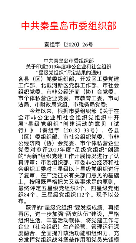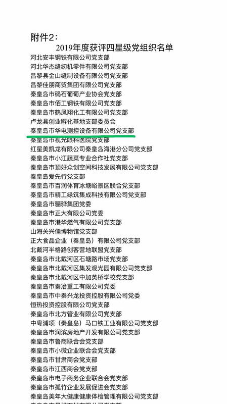 2020年,中共秦皇島華電測(cè)控設(shè)備有限公司支部委員會(huì)通過(guò)自下而上的方式申報(bào)至上級(jí)街道黨工委,上級(jí)黨工委指派專人到基層組織進(jìn)行測(cè)評(píng)、考評(píng),經(jīng)黨委會(huì)議評(píng)定并公示后確定評(píng)星等級(jí),授星,我公司支部委員會(huì)被評(píng)定為四星級(jí)黨組織。