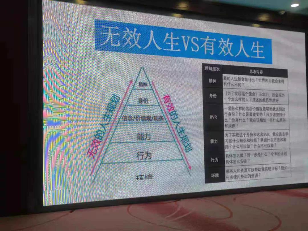首先,劉老師將“有效人生”和”無效人生”進(jìn)行了對比。隨后,劉老師就“精神、身份、信念、能力、行為、環(huán)境”等幾個方面提出了問題,引導(dǎo)我們思考。