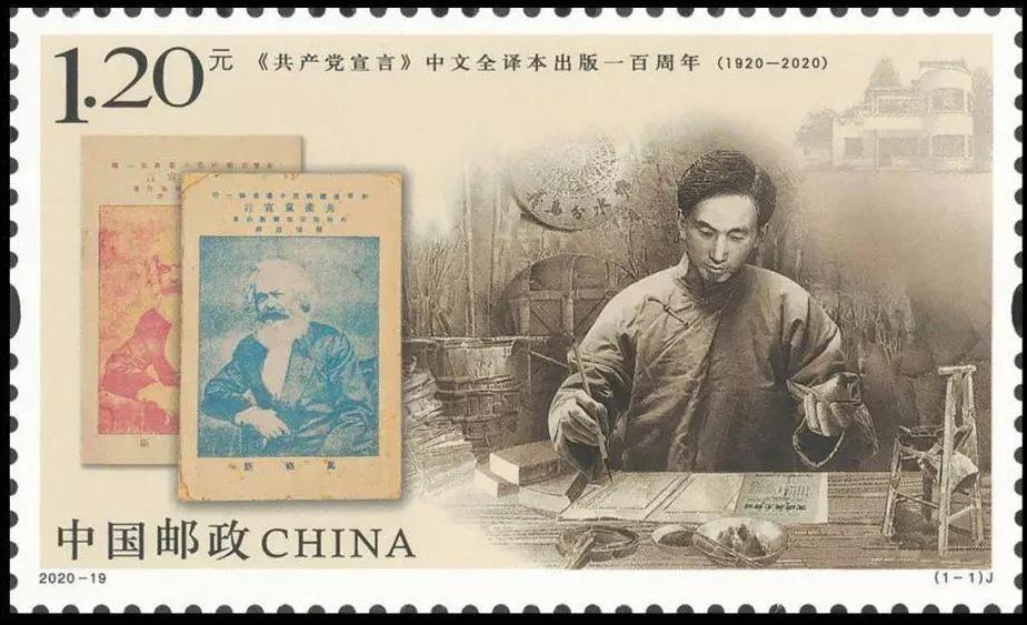 我需要介紹2020年發(fā)行的紀(jì)念郵票:紅印和藍(lán)印馬克思半身肖像的《共產(chǎn)黨宣言》中文全譯本早期版本書影,透射著這本“小冊(cè)子”穿越百年的真理光芒;用鉛筆繪制的陳望道還是未及“三十而已”的年輕模樣,一手奮筆疾書,一手拿著沾了墨汁的粽子,“柴屋勤譯”的場景被高度還原;右上角,位于上海市楊浦區(qū)國福路51號(hào)的《共產(chǎn)黨宣言》展示館(陳望道舊居)見證著他在復(fù)旦長期工作的歲月和復(fù)旦人對(duì)老校長故事的代代講述、對(duì)“宣言精神”的忠實(shí)傳承……