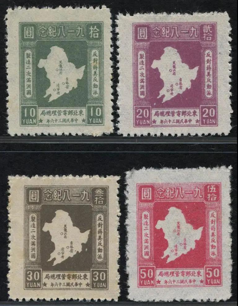 該套郵票一套4枚,圖案相同,就是刷色和面值各異。郵票的圖案主體為中國東北三省地圖,圖中明確標明三省省會的位置和各省名稱。圖案上方印刷郵票主題―“ 九一八紀念”,下方印刷“ 東北郵電管理總局★中華民國三十六年★”發(fā)行單位和發(fā)行時間,左右兩側(cè)印刷當時的口號“ 反對蔣美反動派,制造二次滿洲國”。這套郵票是由哈爾濱廣發(fā)印刷所承印,特別值得一提的是,該套郵票所用的紙張系為原偽滿洲國郵政局遺留庫存的水印絹絲紙,這也是“九一八事變”之后日本侵略者侵占了東北三省長達14年的證據(jù)之一(當時庫存之大,甚至到建國后,新中國發(fā)行的東普二也使用這款“ 水印紙 ”)。