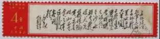 中國郵政曾經(jīng)發(fā)行的一套《毛主席詩詞》文革郵票,圖案均為毛澤東的詩詞手書。其中《毛主席詩詞》郵票第八枚《七律?長征》,是毛澤東在長征期間創(chuàng)作的最為經(jīng)典的一首,寫于1935年秋天,當(dāng)時(shí)中央紅軍已走過最艱難的路程,即將與陜北紅軍勝利會(huì)師。全詩極其精煉地概括了紅軍長征的戰(zhàn)斗歷程,是紅軍長征的全面總結(jié),表現(xiàn)了紅軍的偉大形象和樂觀主義精神,展現(xiàn)了一幅雄偉壯麗的歷史畫卷。毛澤東的這首詩影響最大、傳播最廣。這首詩的手書還出現(xiàn)在2006年10月22日發(fā)行的《中國工農(nóng)紅軍長征勝利七十周年》紀(jì)念郵票小型張“大會(huì)師”的邊紙上。
