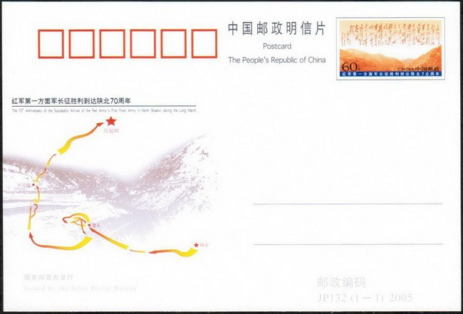 2005年10月19日,在紅一方面軍到達(dá)陜北吳起鎮(zhèn)70周年紀(jì)念日到來之際,國家郵政局曾發(fā)行JP132《紅軍第一方面軍長征勝利到達(dá)陜北70周年》紀(jì)念郵資明信片1套1枚,郵資片的郵資圖案為毛澤東的《七律?長征》詩,郵資片主圖為紅一方面軍長征路線簡(jiǎn)圖,路線圖起點(diǎn)是瑞金,終點(diǎn)為陜北吳起鎮(zhèn)。這枚紀(jì)念郵資明信片的發(fā)行,從側(cè)面證實(shí)了長征題材第一套郵票,紀(jì)念的是紅一方面軍勝利完成二萬五千里長征二十周年。