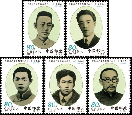 中國共產(chǎn)黨早期組織的創(chuàng)建者和早期領(lǐng)導(dǎo)人王盡美、趙世炎、鄧恩銘、蔡和森、何叔衡,就是這些千千萬萬個共產(chǎn)黨員中的杰出代表。為深切緬懷這些革命先驅(qū)者的光輝業(yè)績,學習繼承和發(fā)揚他們的崇高精神,國家郵政局特于2001年6月28日發(fā)行了《中國共產(chǎn)黨早期領(lǐng)導(dǎo)人(一)》郵票一套5枚。