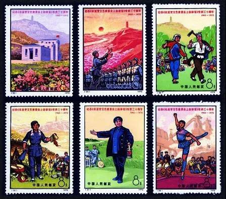 1972年5月23日發(fā)行的編號郵票33-38 紀念《在延安文藝座談會上的講話》發(fā)表三十周年,共6枚。編號郵票33,面值8分,圖案為“座談會會址”。編號郵票34,面值8分,圖案為“高唱革命歌曲”。編號郵票35,面值8分,圖案為“街頭劇《兄妹開荒》”。編號郵票36,面值8分,圖案為“文藝工作者深入工農兵,邊勞動、邊宣傳”。這4枚反映的都是中華人民共和國建國前的情景, 故均以延安寶塔山作為背景。編號郵票37,面值8分,圖案為“為農民演出”。編號郵票38,面值8分,圖案為“為工人演出”;這2枚中的人物是現代京劇《紅燈記》中的李玉和與芭蕾舞劇《紅色娘子軍》中的吳瓊花。
