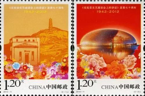 中國郵政于2012年5月23日發(fā)行《<在延安文藝座談會上的講話>發(fā)表七十周年》紀念郵票1套2枚。票圖名稱分別為“座談會舊址”、“文藝發(fā)展繁榮”,郵票面值均為1.20元。設計者為郭線廬。郵票發(fā)行同時推出郵票首日封。