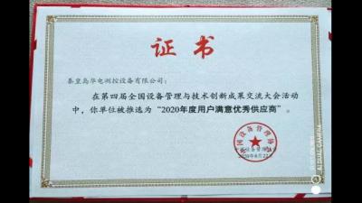 【企業(yè)動態(tài)】您的滿意,我們的動力!” 2020-09-282020年8月22日,秦皇島華電測控設(shè)備有限公司應(yīng)中國設(shè)備管理協(xié)會邀請,參加2020年第四屆全國設(shè)備管理與技術(shù)創(chuàng)新成果交流大會。并被推薦為“2020年度用戶滿意優(yōu)秀供應(yīng)商”。 (華電測控獲獎證書)(華電測控獲得2020年度用More